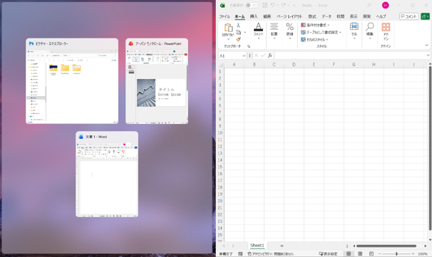 - Excelのウィンドウが右側に表示され、左側には残りのウィンドウが表示候補として表示されます。