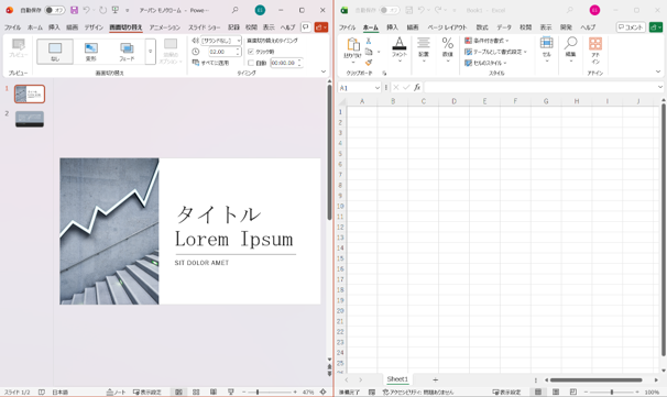 - ExcelとWordのウィンドウが、左右半分ずつの状態で表示されました。